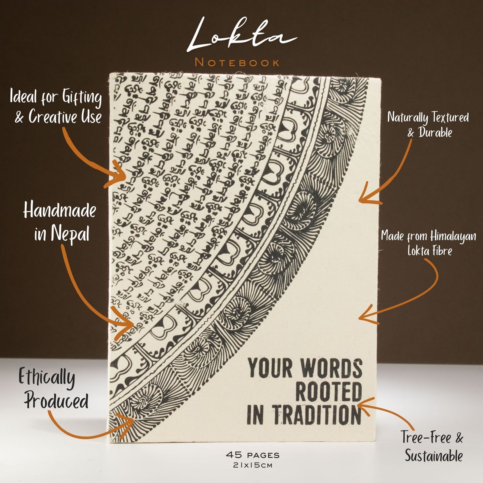 Ce grand carnet Inspiration Lokta arbore un motif tribal élégant en noir et blanc, accompagné de la phrase inspirante : 'Tes mots enracinés dans la tradition'. Un design raffiné qui invite à une réflexion profonde et à une écriture de soi authentique. Fabriqué à la main au Népal, il offre 45 feuilles de papier artisanal d'exception. Marque-page inclus