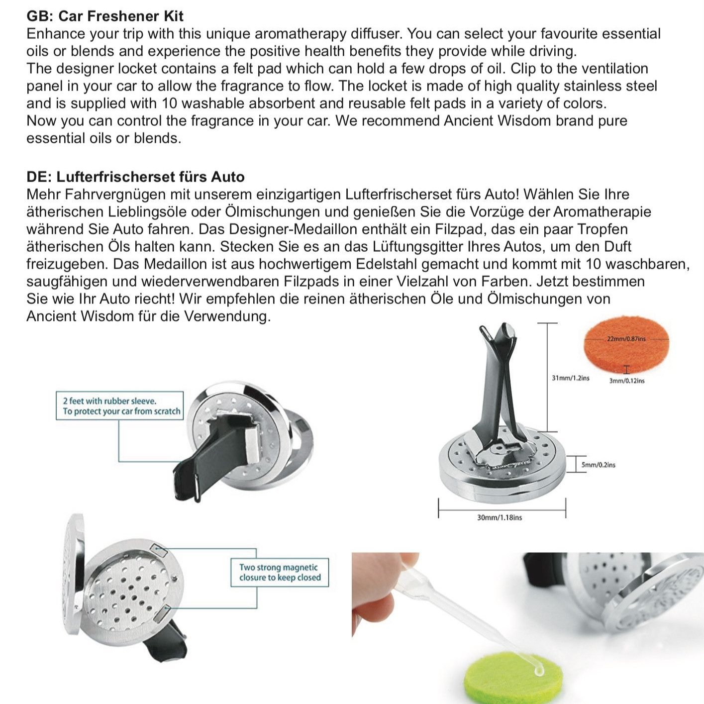 Diffusion Pratique : L'élégant médaillon contient un tampon de feutre qui absorbe quelques gouttes d'huile. Fixez-le simplement à la grille de ventilation pour une diffusion constante.